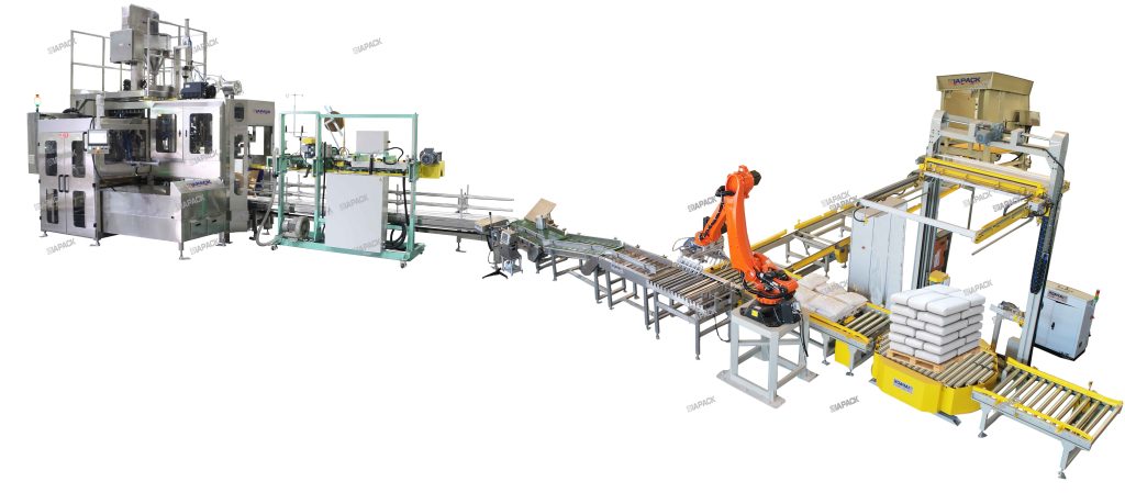 This line is special design for automatic weighing the bulk powder filling bagging in to 15-25kg karft paper bag then sealing the bag .According the client requirement we also need offer the automatic weight check ,metal detector and palletizing .The seller completed the design, manufacturing and supply of the production line in strict accordance with the technical requirements and combined with its own packaging line design experience in the sugar industry.